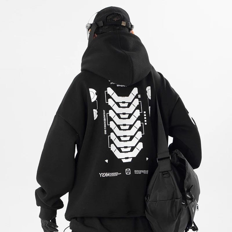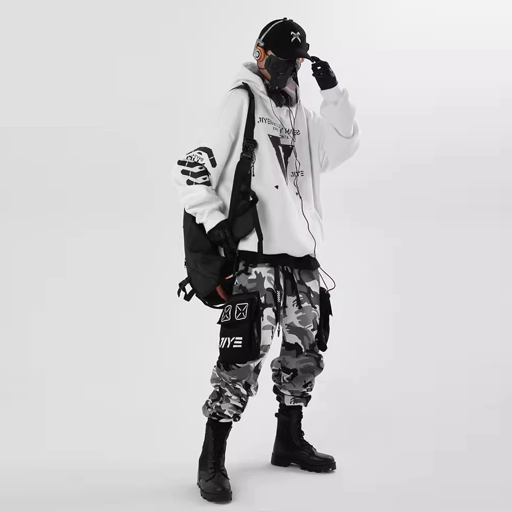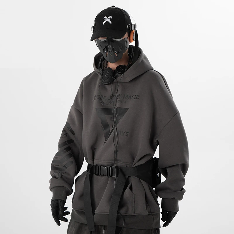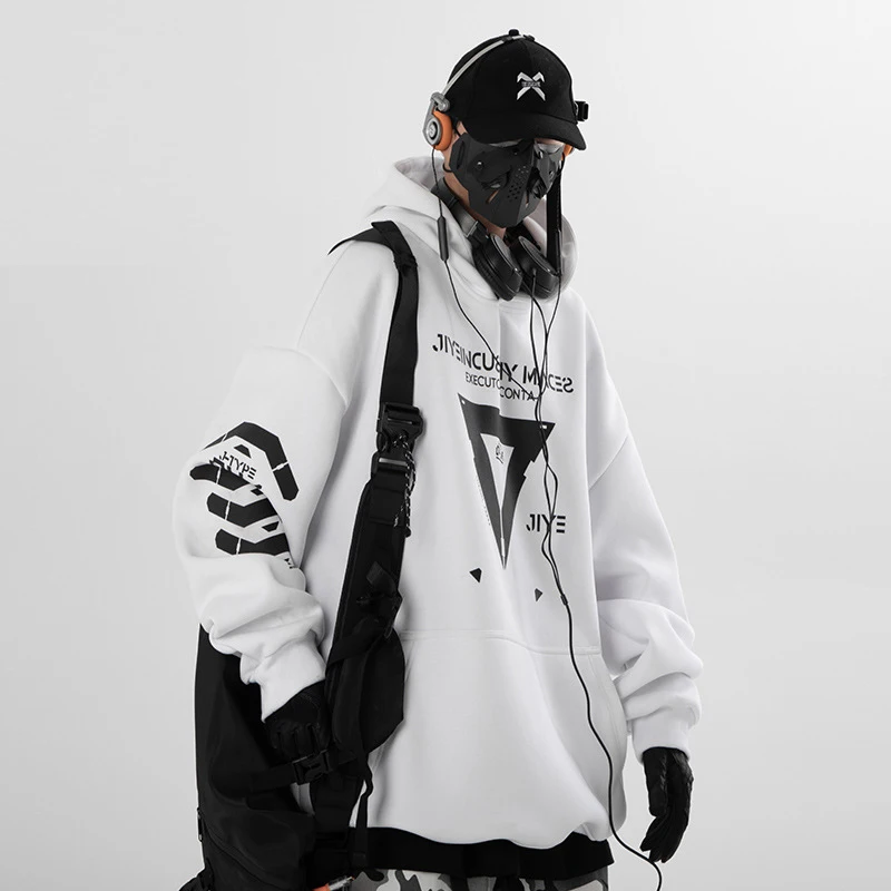 Aby uzyskać stylizację od stóp do głów w stylu techwear, noś tę japońską bluzę z kapturem z czarną czapką streetwear, luźnym T-shirtem i dużym płaszczem techwear, który zapewni Ci ciepło. W przypadku spodni, luźne dżinsy lub spodnie techwear z wieloma kieszeniami będą świetnie wyglądać z parą trampek.