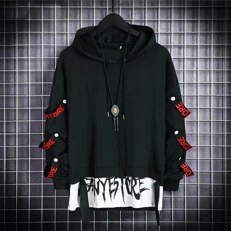 Nasza bluza techwear o regularnym kroju ma rękawy z troczkami. Na każdym rękawie znajdują się trzy paski z nadrukowanymi czerwonymi napisami, które dodają tej bluzie techwear wyjątkowego charakteru. Kawałek materiału z nadrukiem jest wszyty pod bluzę, aby nadać jej długość.