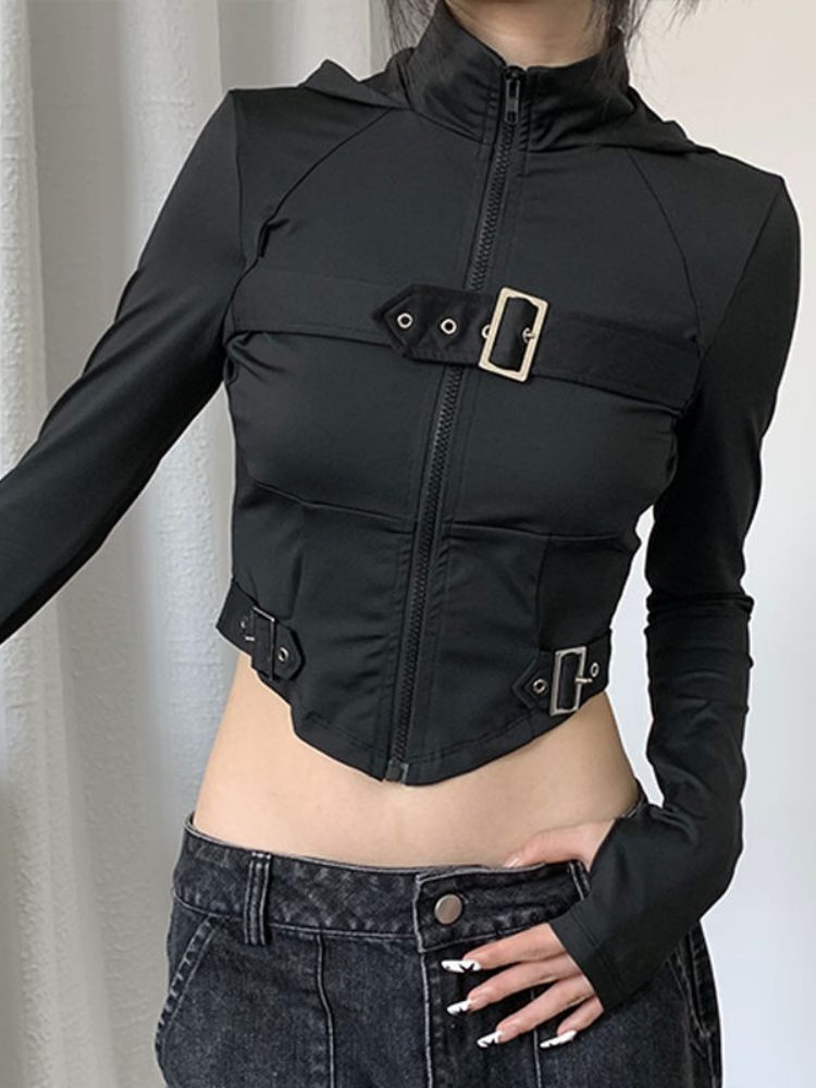 Projekt tej koszulki nawiązuje do elementów cyberpunku i mody streetwear, tworząc unikalną estetykę. Krótki krój dodaje nowoczesności, podkreślając jednocześnie sylwetkę. Zamek błyskawiczny pozwala dopasować dekolt do własnych preferencji. Wbudowane paski podkreślają talię i dodają gotyckiego gorsetowego stylu, który kontrastuje z cyberpunkowym stylem.